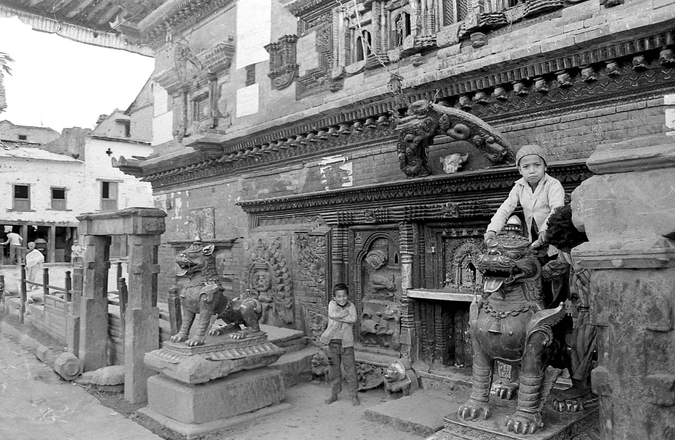 furmanka, Nepal (1)wśród posągów smoków, bawiące się dzieci