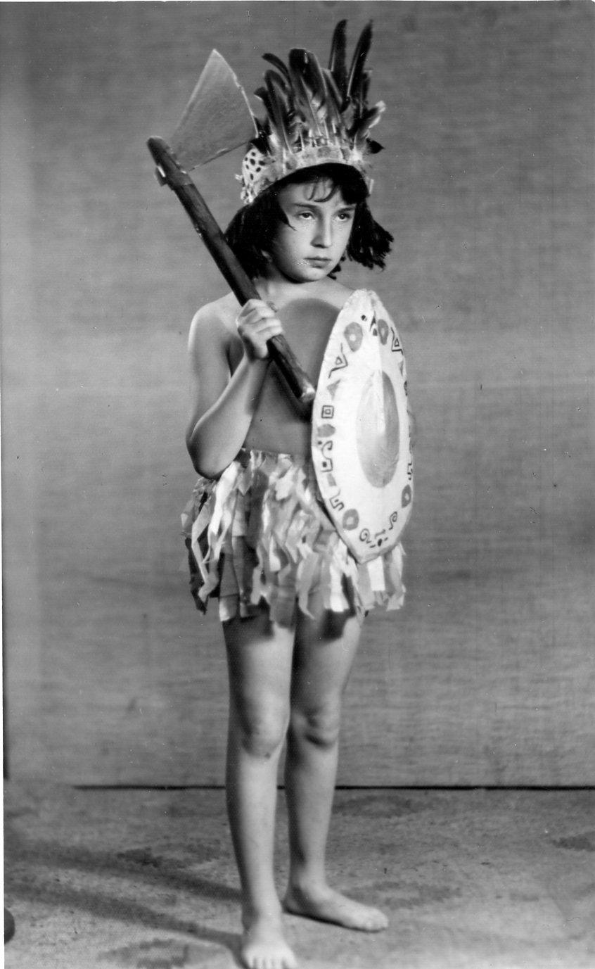 Były sztuczne ognie, a moja matka robiła dla nas dziwaczne, czasem baśniowe, a czasem stylizowane na coś tam, kostiumy... Pewno sama bawiła się tym najlepiej. Niestety zachowało się tylko jedno zdjęcie takiego stroju. Niby Indianin, bo z pióropuszem, ale też z toporkiem i z tarczą.... A może ja na fotografii mam elementy dwóch strojów....