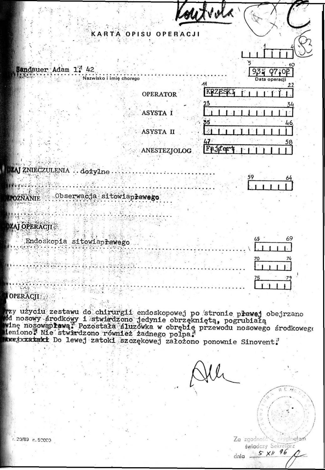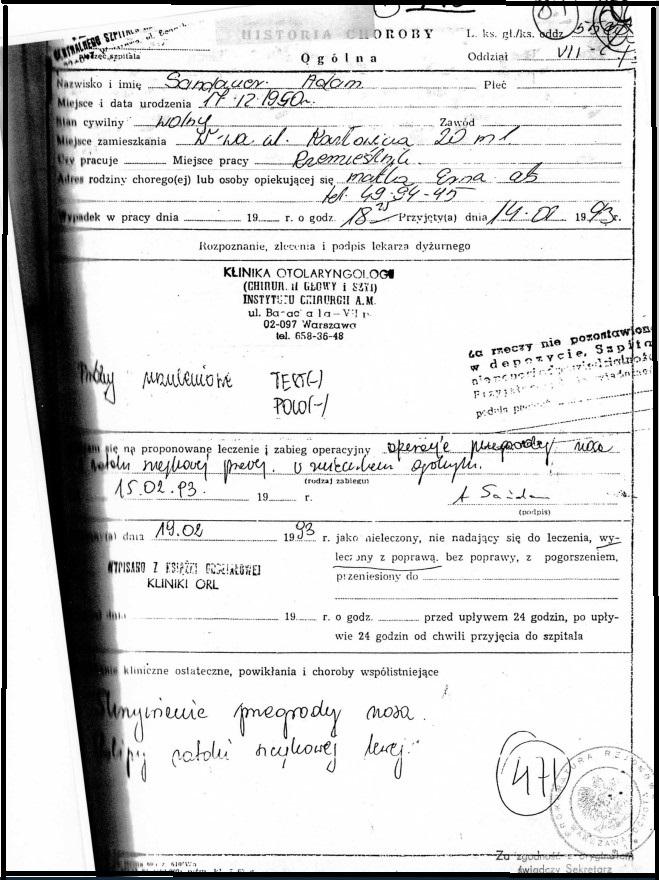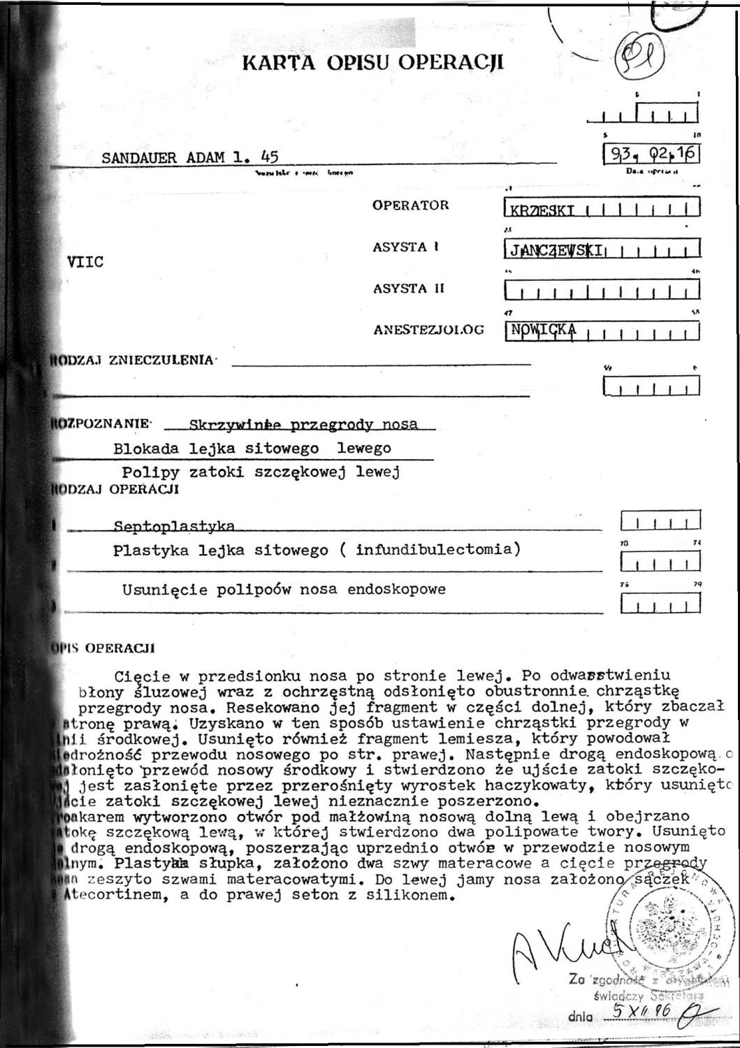W lutym 93 doc. Antoni Krzeski wraz z prof. Grzerzem Janczewskim, operowali mi lewą zatokę szczękową. Usunięto jakieś polipy, łamano i prostowano przegrodę nosową. Wycięte fragmenty wysłano do badania histopatologicznego.